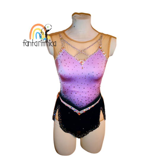 Body per ginnastica ritmica realizzato per Melissa. Colori vivaci viola, fucsia e giallo fluo, con inserti in rete nude e applicazioni di strass che valorizzano il design dinamico , scenografico ed energico, ideale per esibizioni e gare ad alto impatto visivo. ✨